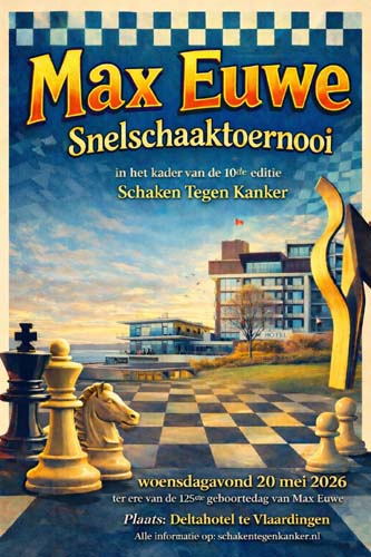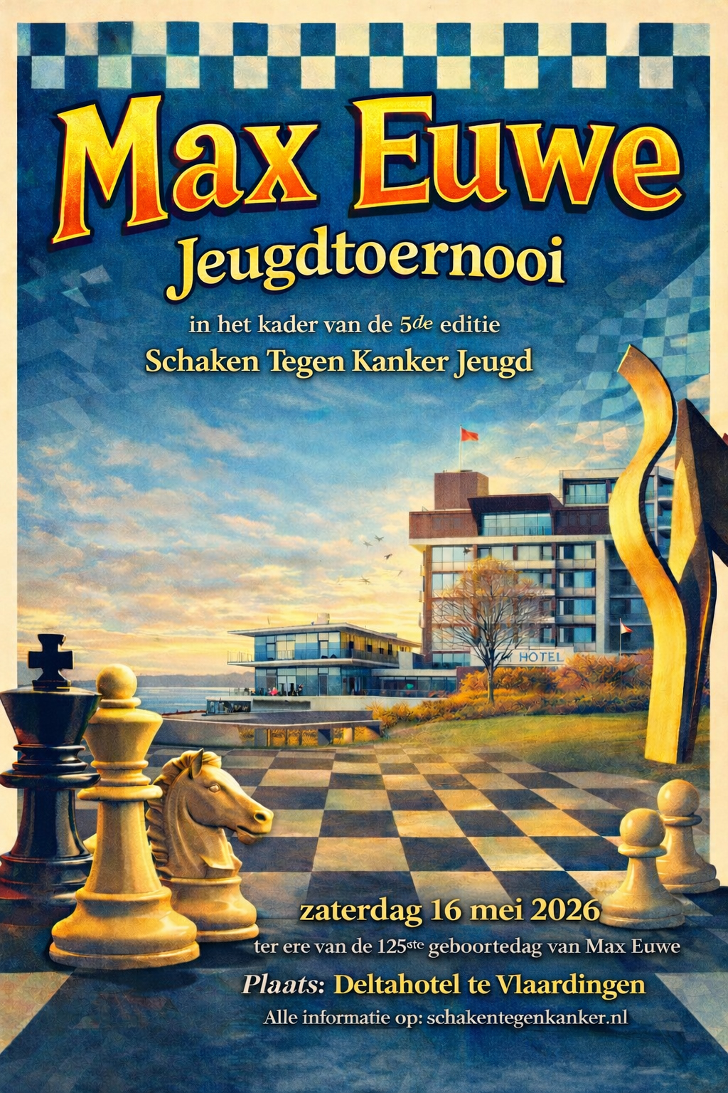 Op zaterdag 16 mei wordt het Max Euwe Jeugdtoernooi gehouden, de 5de jeugdeditie van Schaken tegen Kanker.