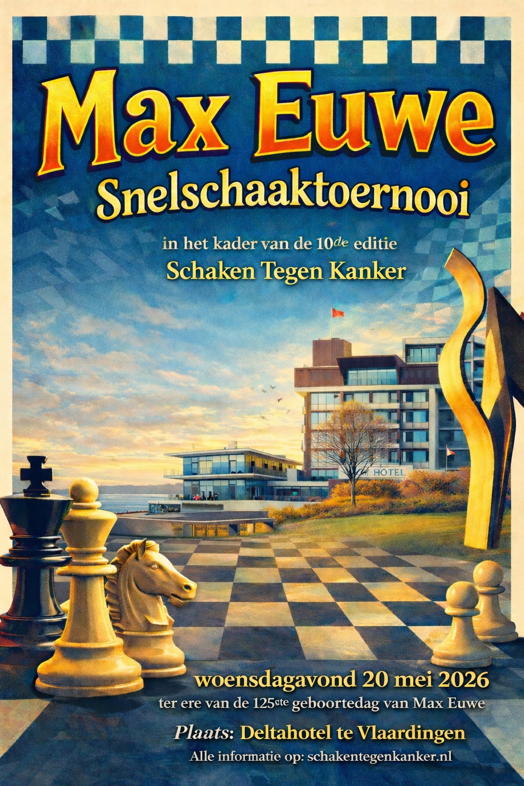 Wij, Ronald Möhrke en ondergetekende, verheugen ons erop dat we de tiende editie van ons Schaken tegen Kanker Toernooi een bijzondere naam mogen geven, die van onze enige wereldkampioen schaken. De reden dat we dit toernooi op woensdagavond 20 mei 2026 organiseren is dat het op deze datum precies 125 jaar geleden is dat Max Euwe werd geboren in Watergraafsmeer. Daarnaast was het Max Euwe die zich inzette voor het Koningin Wilhelmina Fonds! De voorzitter van het Max Euwe Centrum te Amsterdam, dr. H.J. van den Herik, is bereid gevonden het toernooi te openen.